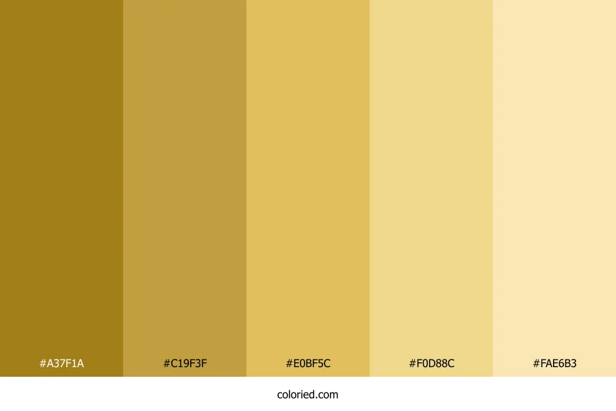 ![]() | #A37F1A | 163, 127, 26 | 44, 72%, 37% | 0%, 22%, 84%, 36% | oklch(0.615 0.118 87) |