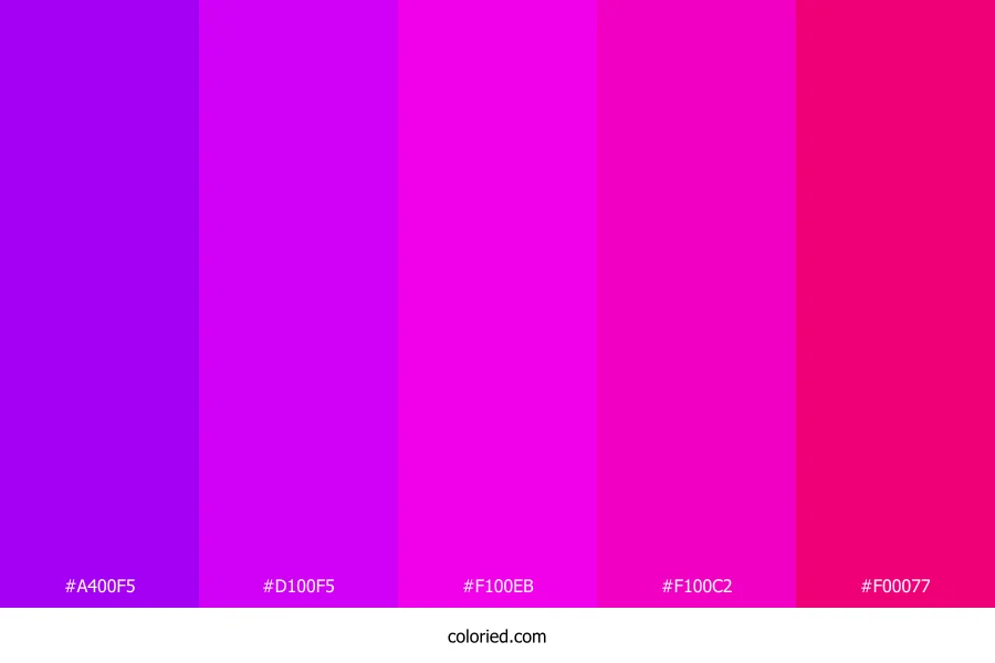 | #F100C2 | 241, 0, 194 | 312, 100%, 47% | 0%, 100%, 20%, 5% | oklch(0.647 0.281 340) | |