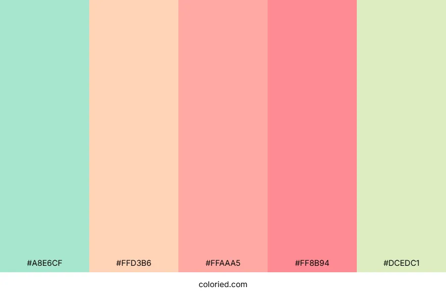 Animal crossing color palette includes 5 carefully selected colors: mint (#a8e6cf), peach (#ffd3b6), light coral (#ffaaa5), rose (#ff8b94), and soft green (#dcedc1).