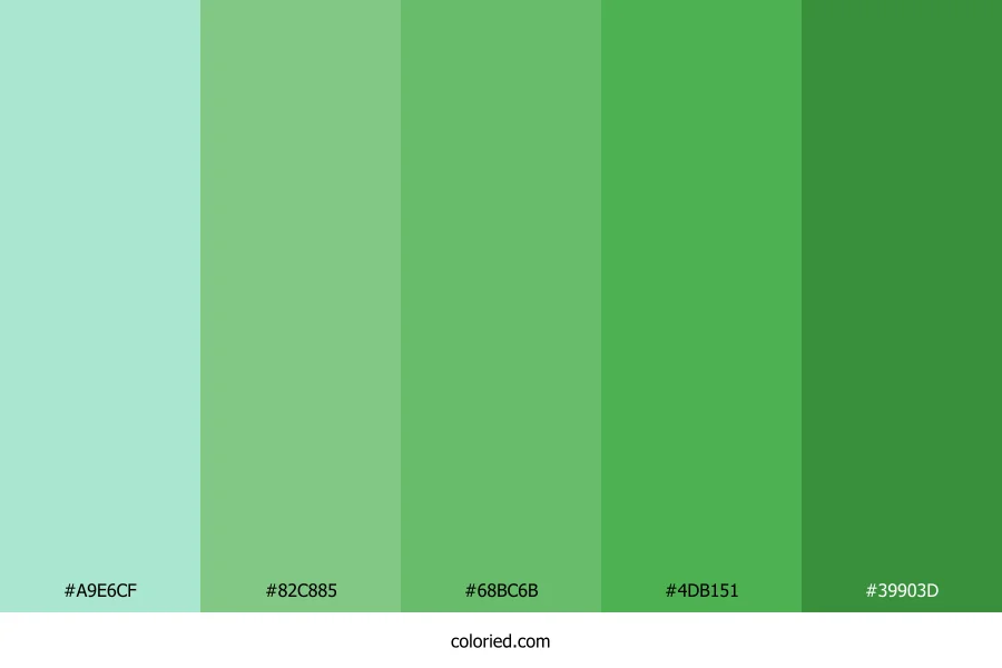 ![]() | #A9E6CF | 169, 230, 207 | 157, 55%, 78% | 27%, 0%, 10%, 10% | oklch(0.877 0.070 169) |