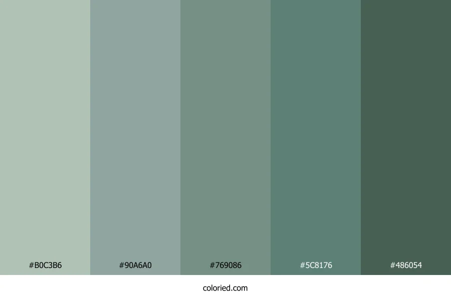 | #5C8176 | 92, 129, 118 | 162, 17%, 43% | 29%, 0%, 9%, 49% | oklch(0.572 0.045 174) | |