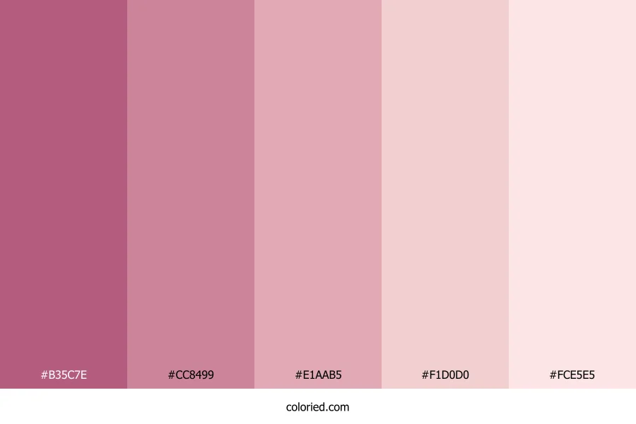 ![]() | #B35C7E | 179, 92, 126 | 337, 36%, 53% | 0%, 49%, 30%, 30% | oklch(0.588 0.119 357) |