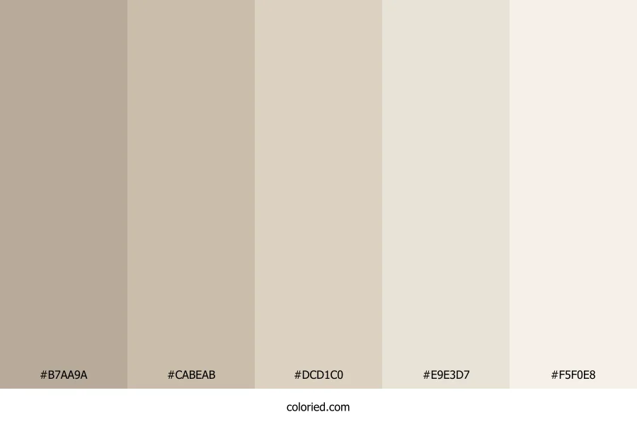 ![]() | #B7AA9A | 183, 170, 154 | 33, 17%, 66% | 0%, 7%, 16%, 28% | oklch(0.745 0.027 73) |