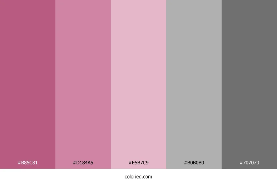 ![]() | #B85C81 | 184, 92, 129 | 336, 39%, 54% | 0%, 50%, 30%, 28% | oklch(0.596 0.125 356) |