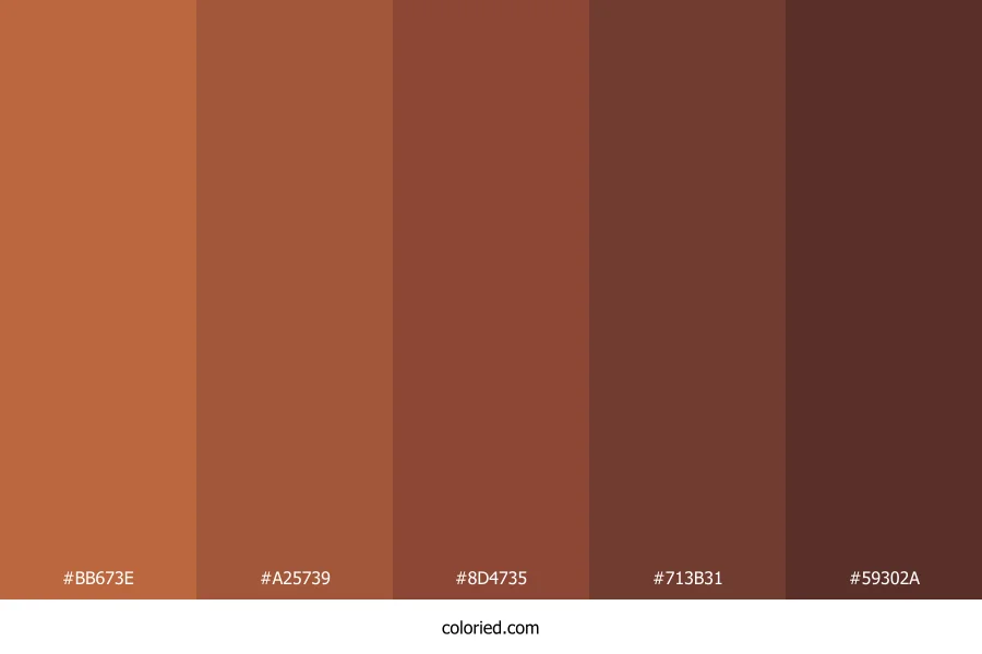 | #8D4735 | 141, 71, 53 | 12, 45%, 38% | 0%, 50%, 62%, 45% | oklch(0.481 0.100 35) | |