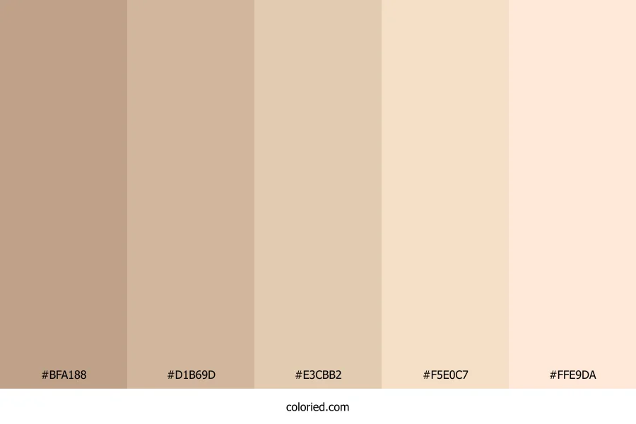 | #E3CBB2 | 227, 203, 178 | 31, 47%, 79% | 0%, 11%, 22%, 11% | oklch(0.856 0.043 68) | |