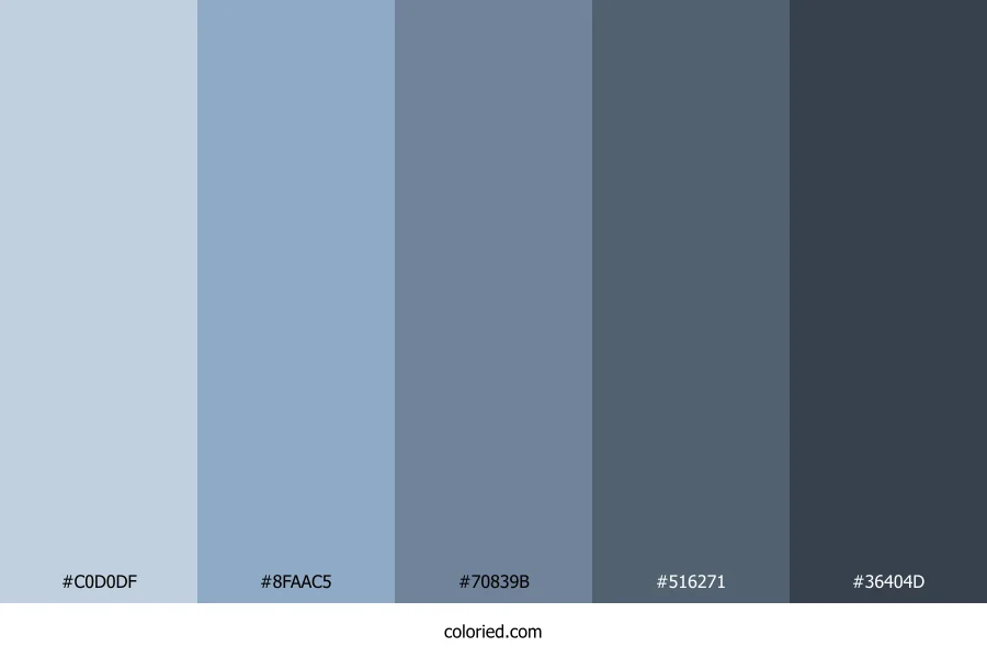 ![]() | #C0D0DF | 192, 208, 223 | 209, 33%, 81% | 14%, 7%, 0%, 13% | oklch(0.850 0.027 246) |