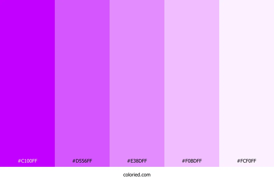 ![]() | #C100FF | 193, 0, 255 | 285, 100%, 50% | 24%, 100%, 0%, 0% | oklch(0.612 0.304 313) |