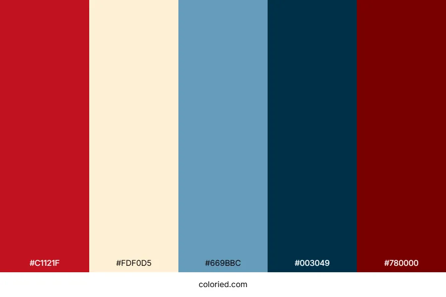 Fall photoshoot color palette includes 5 carefully selected colors: crimson (#c1121f), cream (#fdf0d5), muted blue (#669bbc), midnight blue (#003049), and burgundy (#780000).