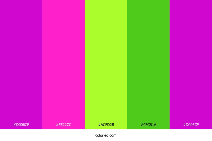 ![]() | #D006CF | 208, 6, 207 | 300, 94%, 42% | 0%, 97%, 0%, 18% | oklch(0.602 0.274 329) |