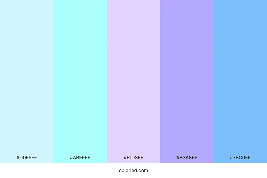 Frozen color palette includes 5 carefully selected colors: light cyan (#d0f5ff), pale aqua (#abffff), lavender mist (#e1d3ff), soft lavender (#b3a8ff), and light sky blue (#7bc0ff).
