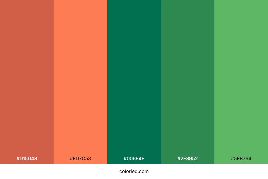 Coral and green color palette includes 5 carefully selected colors: terra cotta (#d15d48), coral (#fd7c53), dark teal green (#006f4f), forest green (#2f8952), and emerald green (#5eb764).