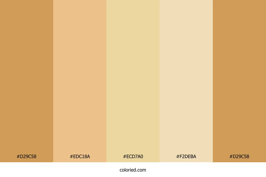 | #ECD7A0 | 236, 215, 160 | 43, 67%, 78% | 0%, 9%, 32%, 7% | oklch(0.883 0.075 90) | |