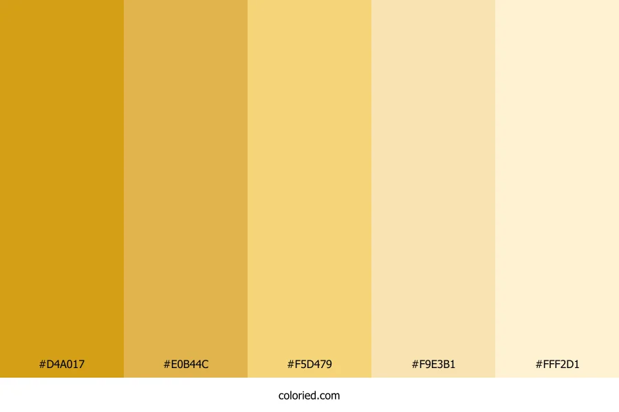 ![]() | #D4A017 | 212, 160, 23 | 43, 80%, 46% | 0%, 25%, 89%, 17% | oklch(0.735 0.146 84) |