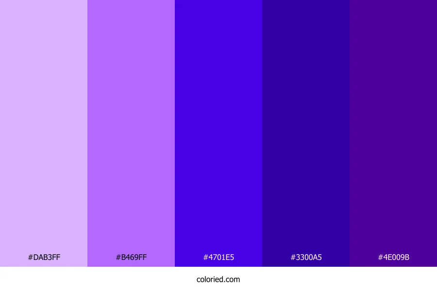 | #4E009B | 78, 0, 155 | 270, 100%, 30% | 50%, 100%, 0%, 39% | oklch(0.369 0.202 295) |
