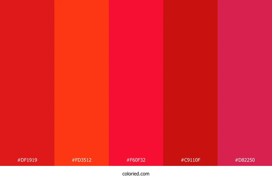 ![]() | #DF1919 | 223, 25, 25 | 0, 80%, 49% | 0%, 89%, 89%, 13% | oklch(0.575 0.225 28) |