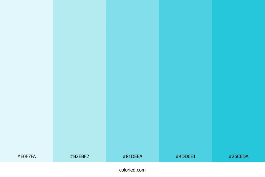 | #81DEEA | 129, 222, 234 | 187, 71%, 71% | 45%, 5%, 0%, 8% | oklch(0.847 0.090 206) | |