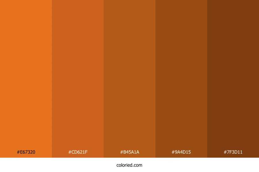 ![]() | #E67320 | 230, 115, 32 | 25, 80%, 51% | 0%, 50%, 86%, 10% | oklch(0.678 0.167 50) |
