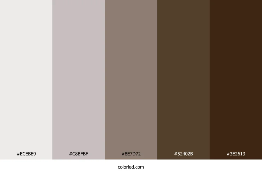 | #8E7D72 | 142, 125, 114 | 24, 11%, 50% | 0%, 12%, 20%, 44% | oklch(0.602 0.027 55) | |