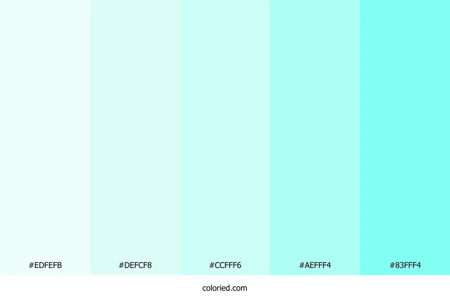 ![]() | #EDFEFB | 237, 254, 251 | 169, 89%, 96% | 7%, 0%, 1%, 0% | oklch(0.984 0.018 185) |