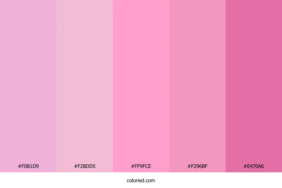 | #F2BDD5 | 242, 189, 213 | 333, 67%, 85% | 0%, 22%, 12%, 5% | oklch(0.853 0.068 350) | |