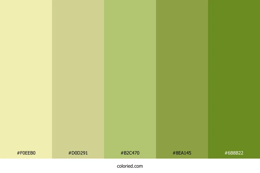 | #8EA145 | 142, 161, 69 | 72, 40%, 45% | 12%, 0%, 57%, 37% | oklch(0.675 0.120 120) | |
