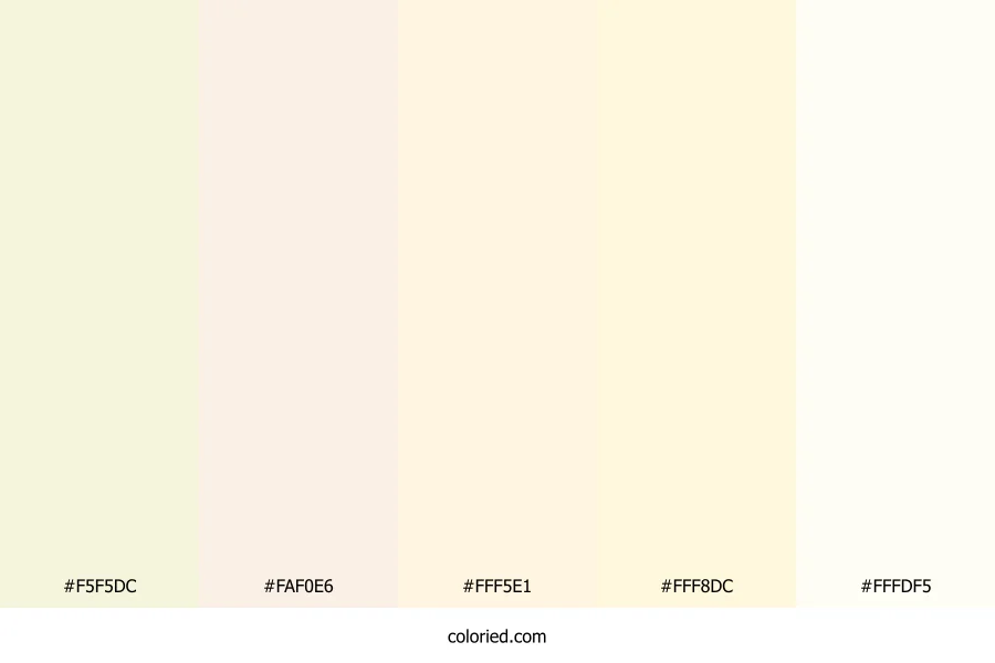 ![]() | #F5F5DC | 245, 245, 220 | 60, 56%, 91% | 0%, 0%, 10%, 4% | oklch(0.964 0.033 107) |