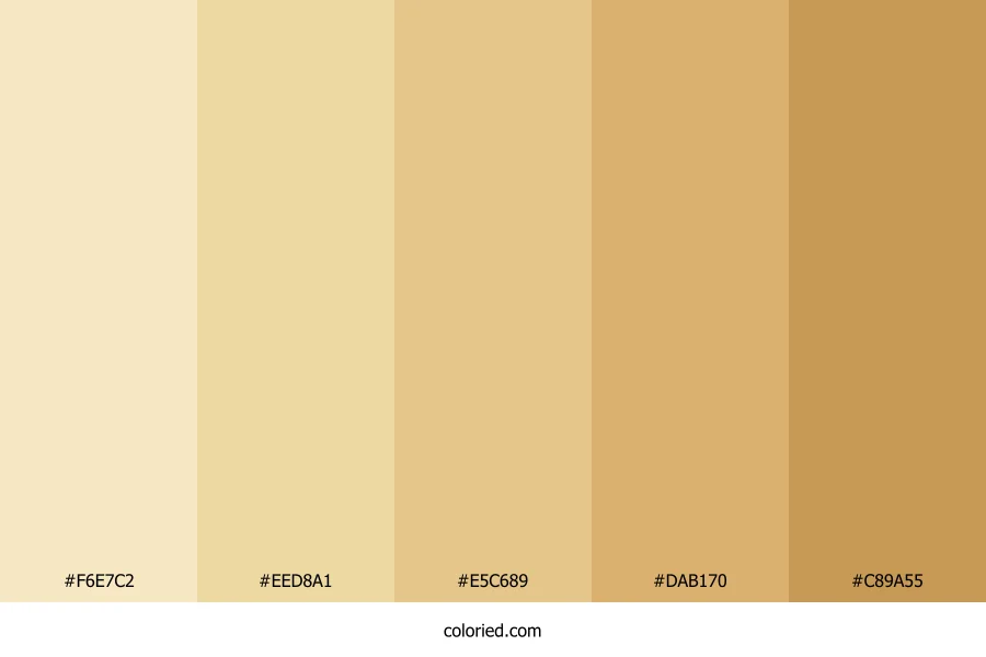 | #EED8A1 | 238, 216, 161 | 43, 69%, 78% | 0%, 9%, 32%, 7% | oklch(0.887 0.075 89) | |