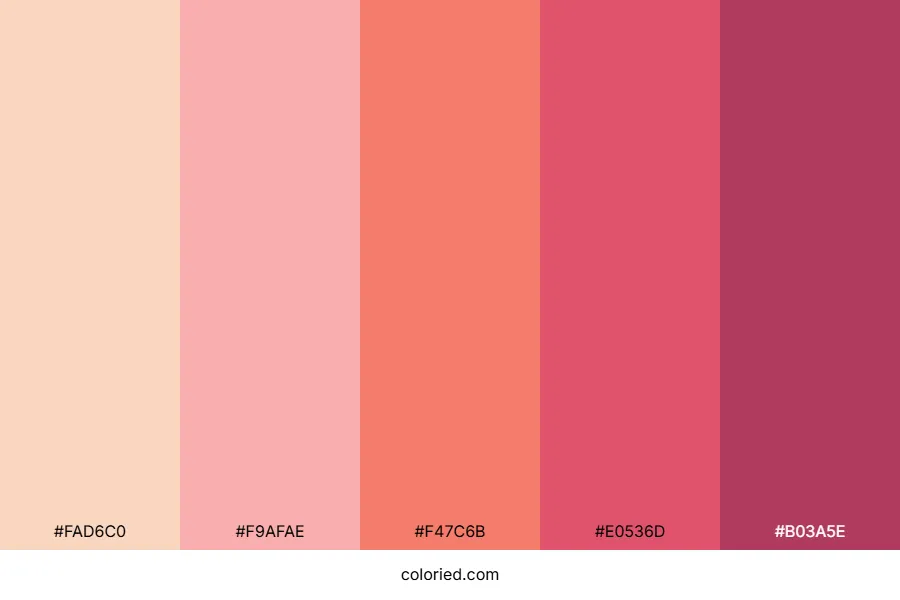Princess peach color palette includes 5 carefully selected colors: peach puff (#fad6c0), light coral pink (#f9afae), coral (#f47c6b), raspberry pink (#e0536d), and deep rose (#b03a5e).