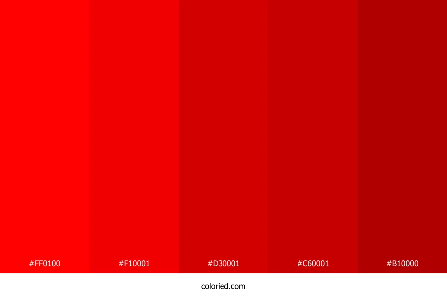 ![]() | #FF0100 | 255, 1, 0 | 0, 100%, 50% | 0%, 100%, 100%, 0% | oklch(0.628 0.257 29) |