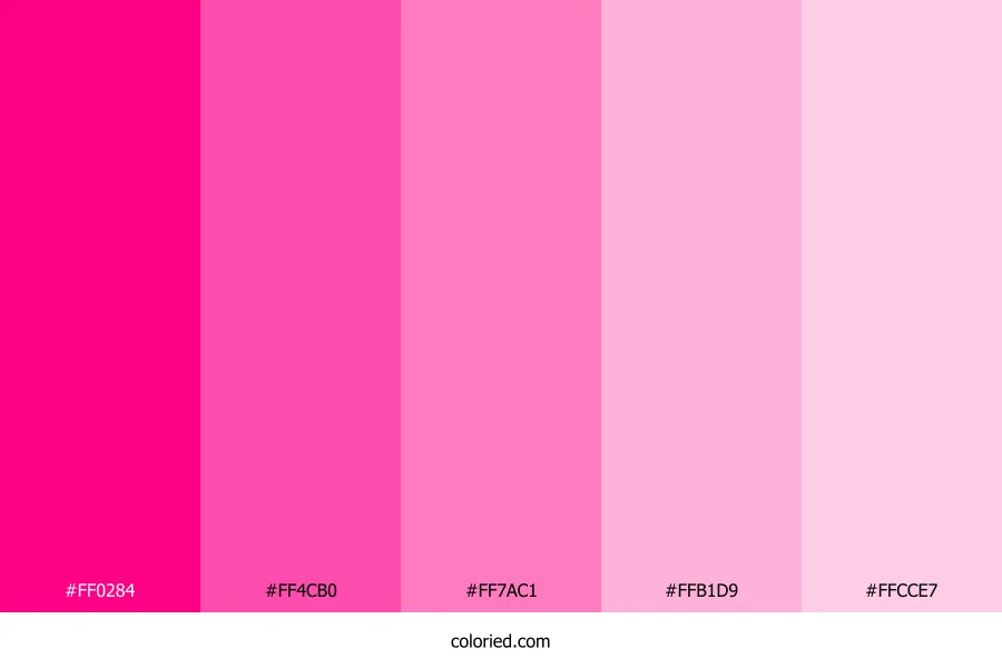 ![]() | #FF0284 | 255, 2, 132 | 329, 100%, 50% | 0%, 99%, 48%, 0% | oklch(0.647 0.261 1) |