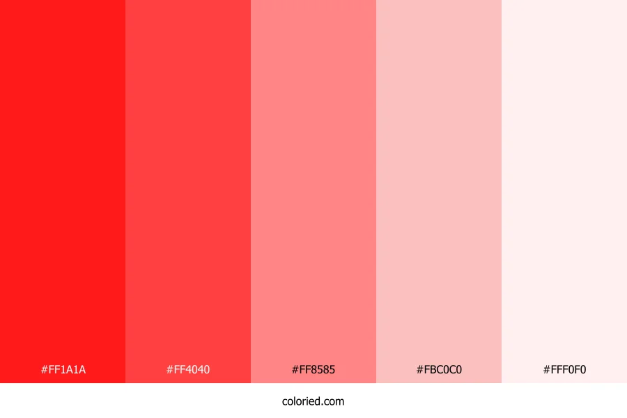 ![]() | #FF1A1A | 255, 26, 26 | 0, 100%, 55% | 0%, 90%, 90%, 0% | oklch(0.635 0.251 28) |