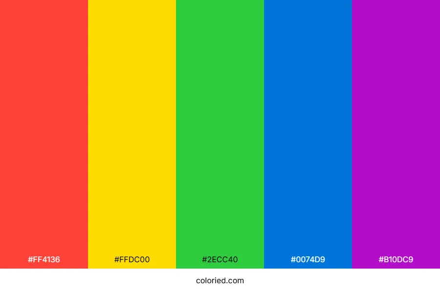 Pop art color palette includes 5 carefully selected colors: red orange (#ff4136), bright yellow (#ffdc00), lime green (#2ecc40), vivid blue (#0074d9), and electric purple (#b10dc9).