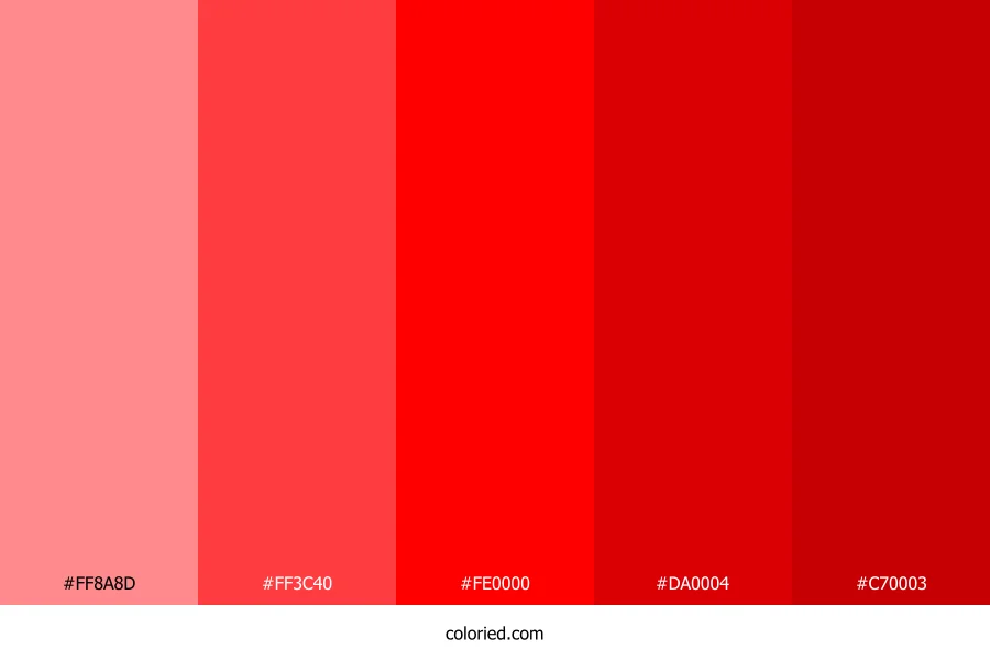 | #FE0000 | 254, 0, 0 | 0, 100%, 50% | 0%, 100%, 100%, 0% | oklch(0.626 0.257 29) | |