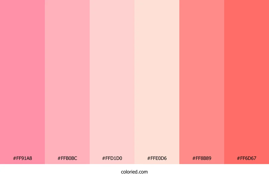| #FFD1D0 | 255, 209, 208 | 1, 100%, 91% | 0%, 18%, 18%, 0% | oklch(0.900 0.052 20) | |