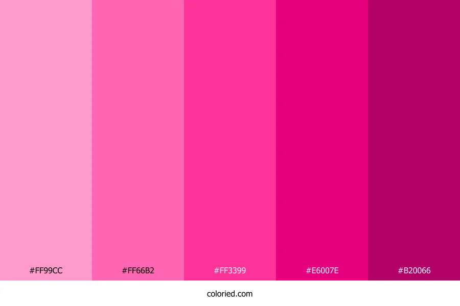 | #FF3399 | 255, 51, 153 | 330, 100%, 60% | 0%, 80%, 40%, 0% | oklch(0.670 0.246 356) | |