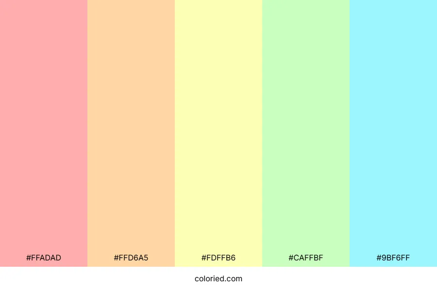 Summer light color palette includes 5 carefully selected colors: light salmon (#ffadad), peach (#ffd6a5), cream yellow (#fdffb6), tea green (#caffbf), and ice blue (#9bf6ff).