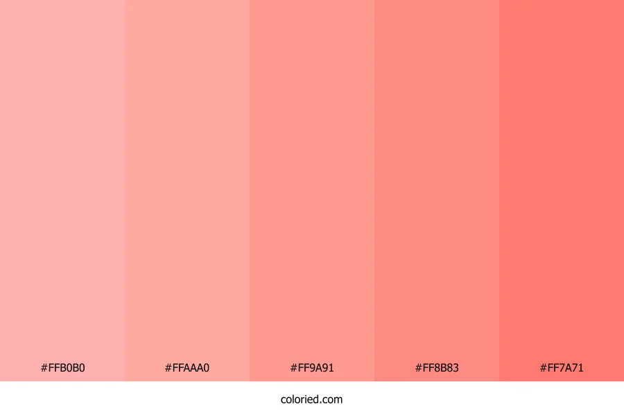 | #FF9A91 | 255, 154, 145 | 5, 100%, 78% | 0%, 40%, 43%, 0% | oklch(0.788 0.122 26) | |