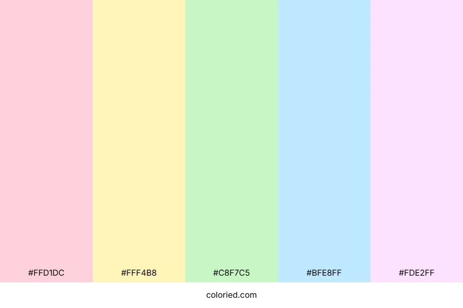 Spring light color palette includes 5 carefully selected colors: pastel pink (#ffd1dc), soft yellow (#fff4b8), mint green (#c8f7c5), baby blue (#bfe8ff), and lavender mist (#fde2ff).