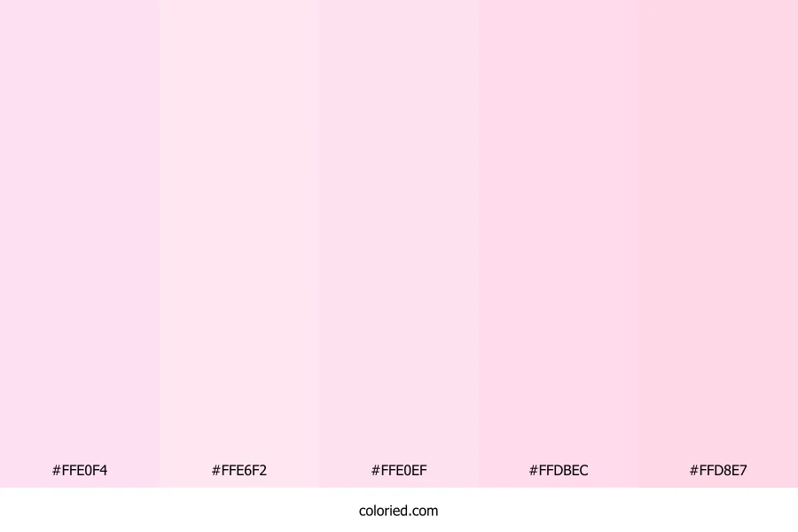 | #FFE0EF | 255, 224, 239 | 331, 100%, 94% | 0%, 12%, 6%, 0% | oklch(0.936 0.039 347) | |