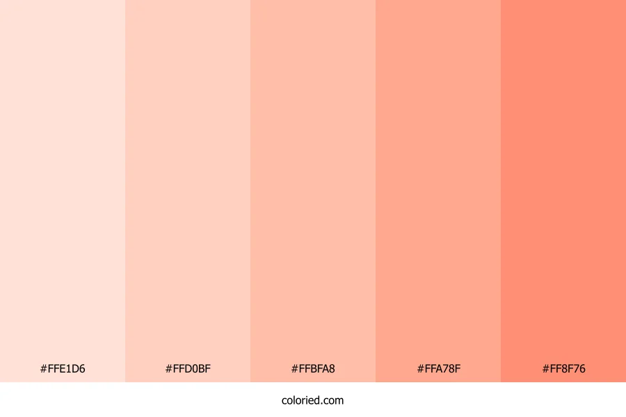 | #FFBFA8 | 255, 191, 168 | 16, 100%, 83% | 0%, 25%, 34%, 0% | oklch(0.857 0.081 41) | |