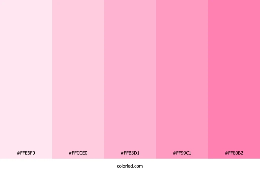 | #FF80B2 | 255, 128, 178 | 336, 100%, 75% | 0%, 50%, 30%, 0% | oklch(0.757 0.162 357) |
