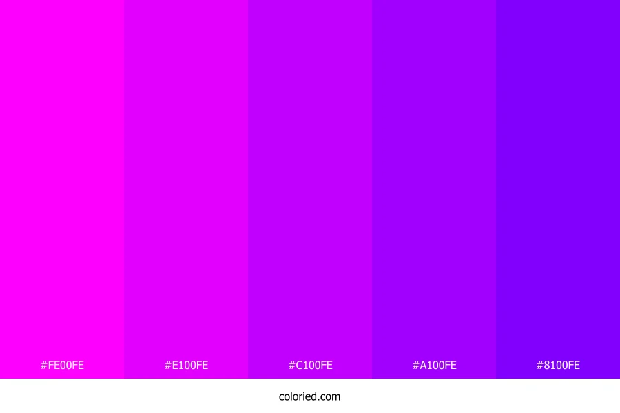 | #E100FE | 225, 0, 254 | 293, 100%, 50% | 11%, 100%, 0%, 0% | oklch(0.657 0.312 322) | |