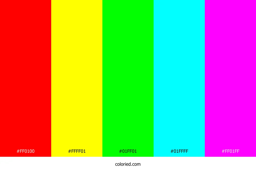 | #FF01FF | 255, 1, 255 | 300, 100%, 50% | 0%, 100%, 0%, 0% | oklch(0.702 0.322 328) |