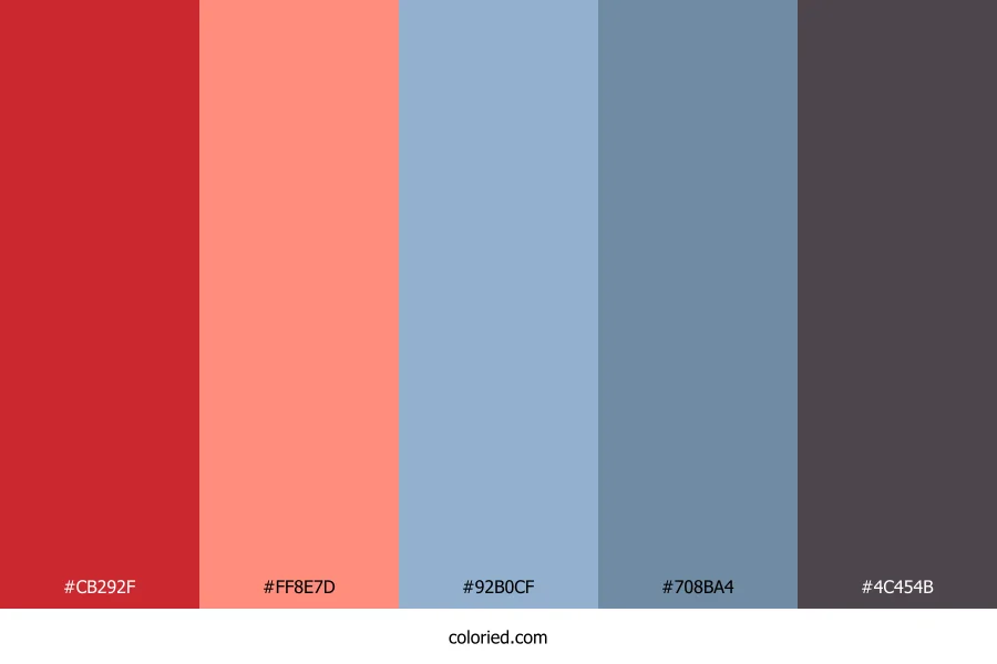 ![]() | #CB292F | 203, 41, 47 | 358, 66%, 48% | 0%, 80%, 77%, 20% | oklch(0.549 0.197 25) |