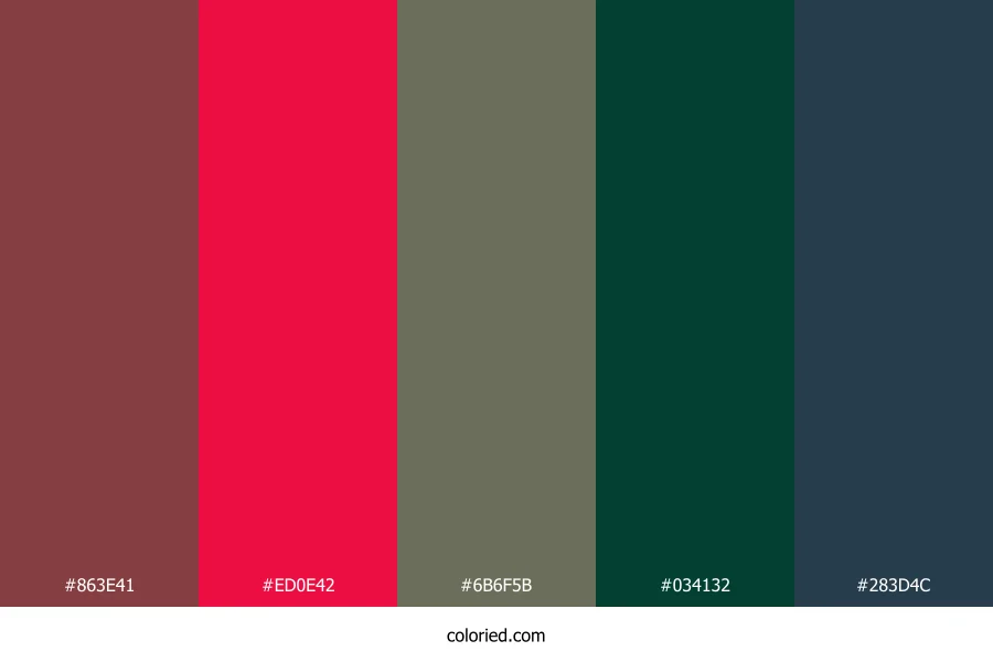 ![]() | #863E41 | 134, 62, 65 | 357, 37%, 38% | 0%, 54%, 51%, 47% | oklch(0.458 0.099 19) |