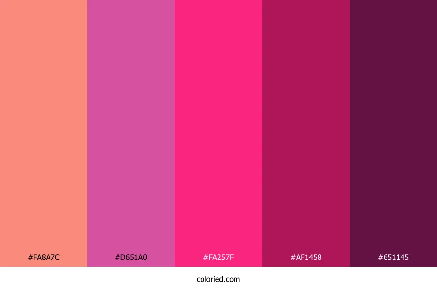| #FA257F | 250, 37, 127 | 335, 96%, 56% | 0%, 85%, 49%, 2% | oklch(0.646 0.244 3) | |