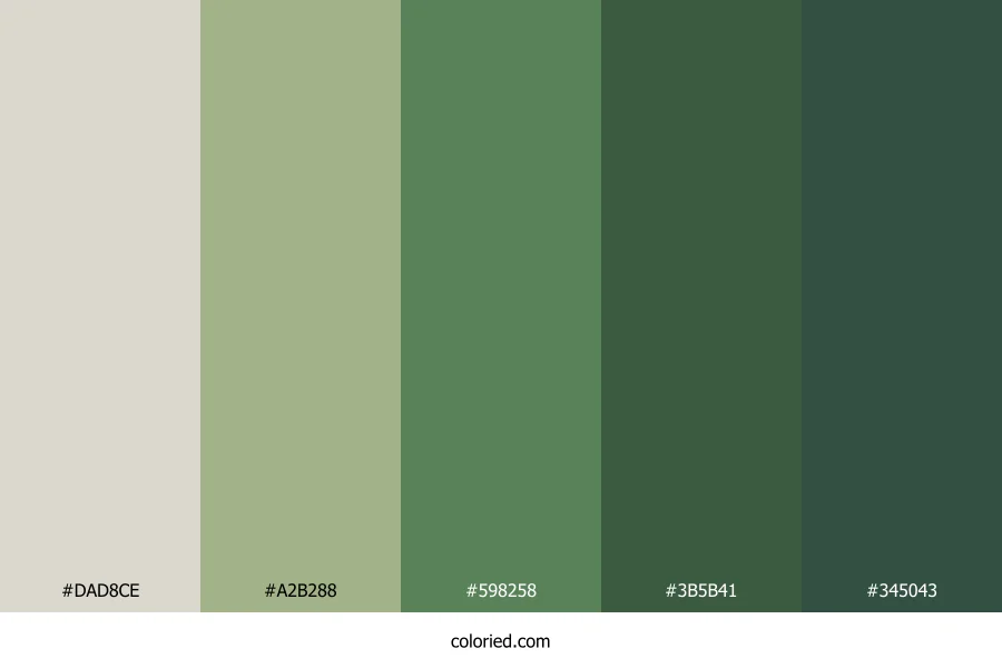 | #3B5B41 | 59, 91, 65 | 131, 21%, 29% | 35%, 0%, 29%, 64% | oklch(0.438 0.057 150) | |
