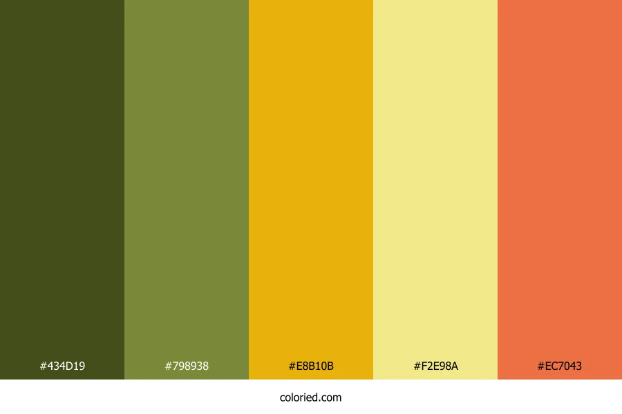 ![]() | #434D19 | 67, 77, 25 | 72, 51%, 20% | 13%, 0%, 68%, 70% | oklch(0.399 0.075 119) |