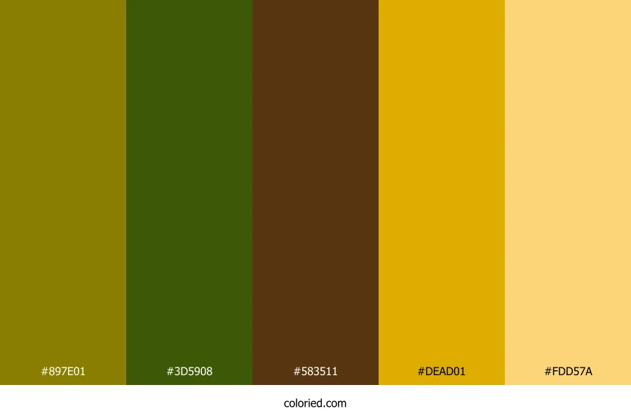 ![]() | #897E01 | 137, 126, 1 | 55, 99%, 27% | 0%, 8%, 99%, 46% | oklch(0.585 0.123 103) |